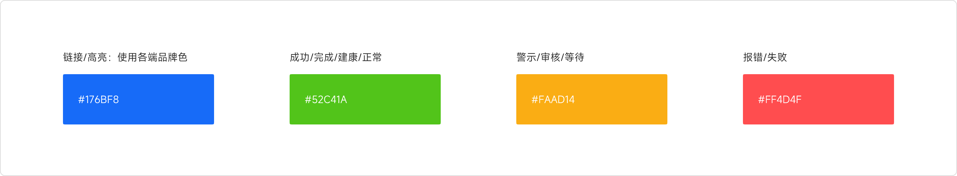 功能色代表了明确的信息以及状态,比如成功、出错、失败、提醒、链接等。功能色的选取遵守了用户对色彩的基本认知。建议在一套产品体系下,功能色尽量保持一致,不要有过多的自定义干扰用户的认知体验。应用场景包括:各类状态、标签、图标、提示、链接、关键行动点,重要信息高亮,图形化等场景。