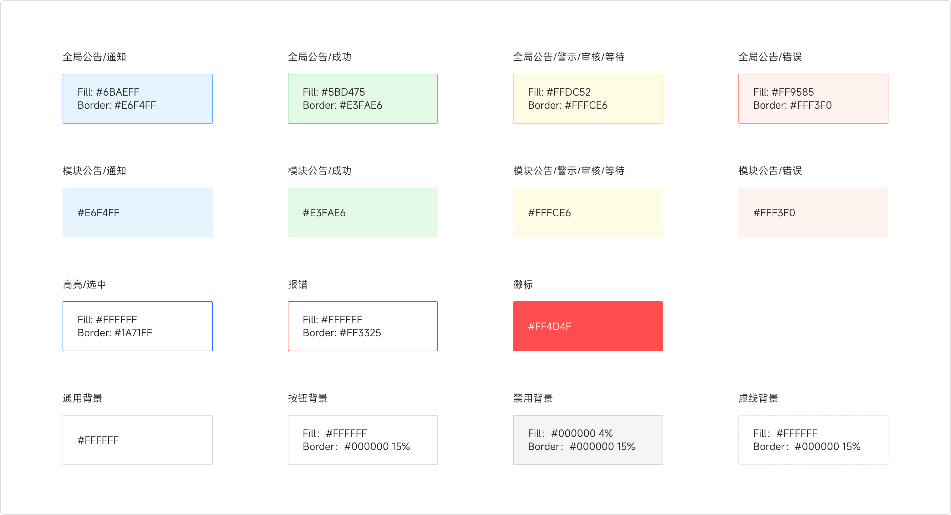 从功能色中延伸出容器高亮色/背景色,包含基础组件的背景,如按钮,输入框,卡片,全局通知公告等
