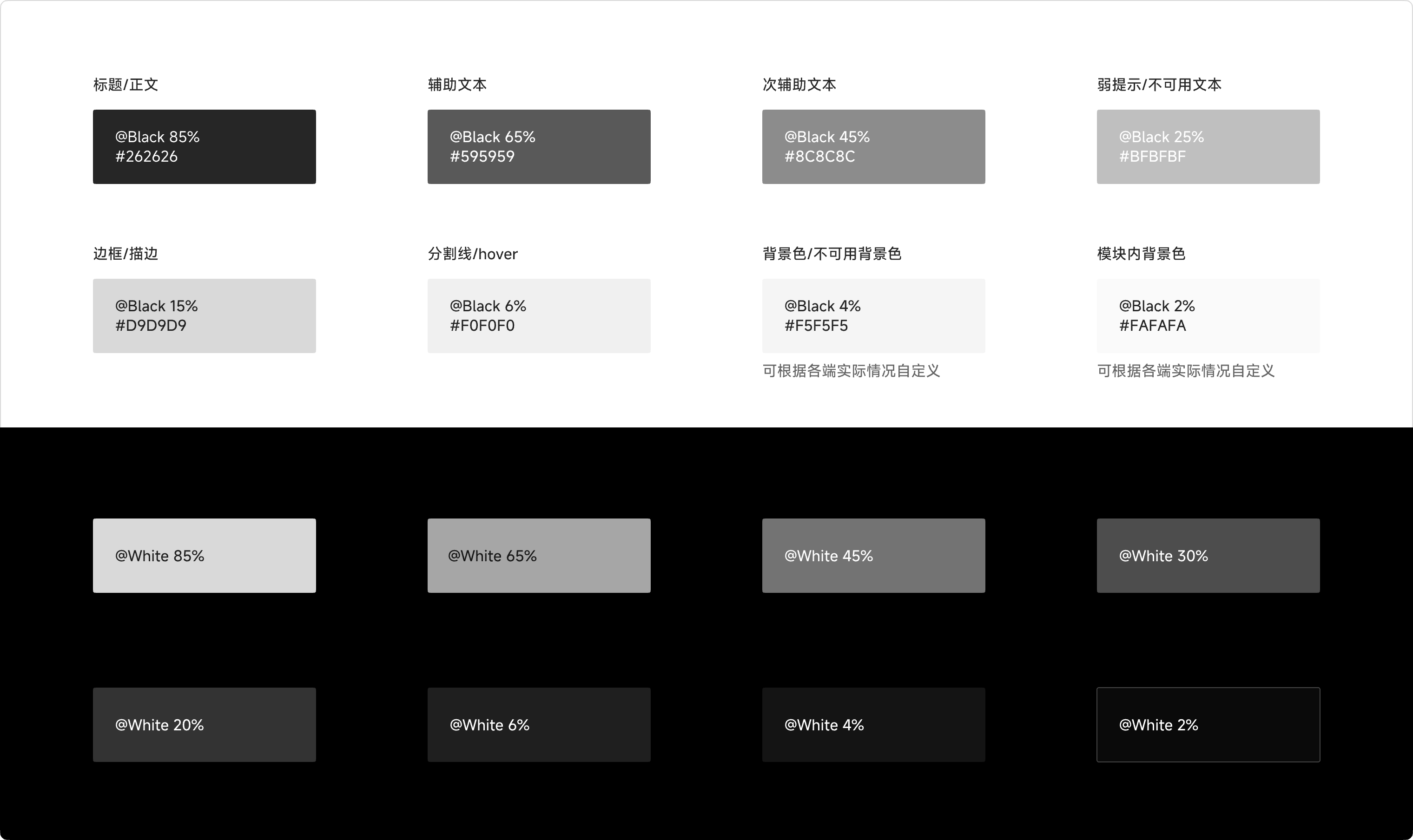 以透明梯度作为中性色能够确保更好的融入不同的背景色中,用于文字、背景、分割线等,合理地选择中性色能够令页面信息具备良好的主次关系,助力阅读体验。