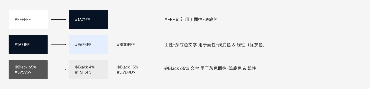 标签类型共分为三类:面性-深底色、 面性-浅底色、线性。标签中的底色背景、文字图标、线性边框分别对应不同的色阶,严格按照色彩规范使用。