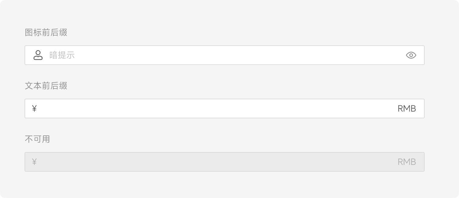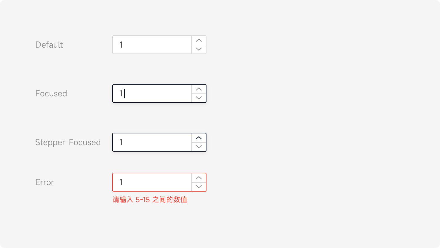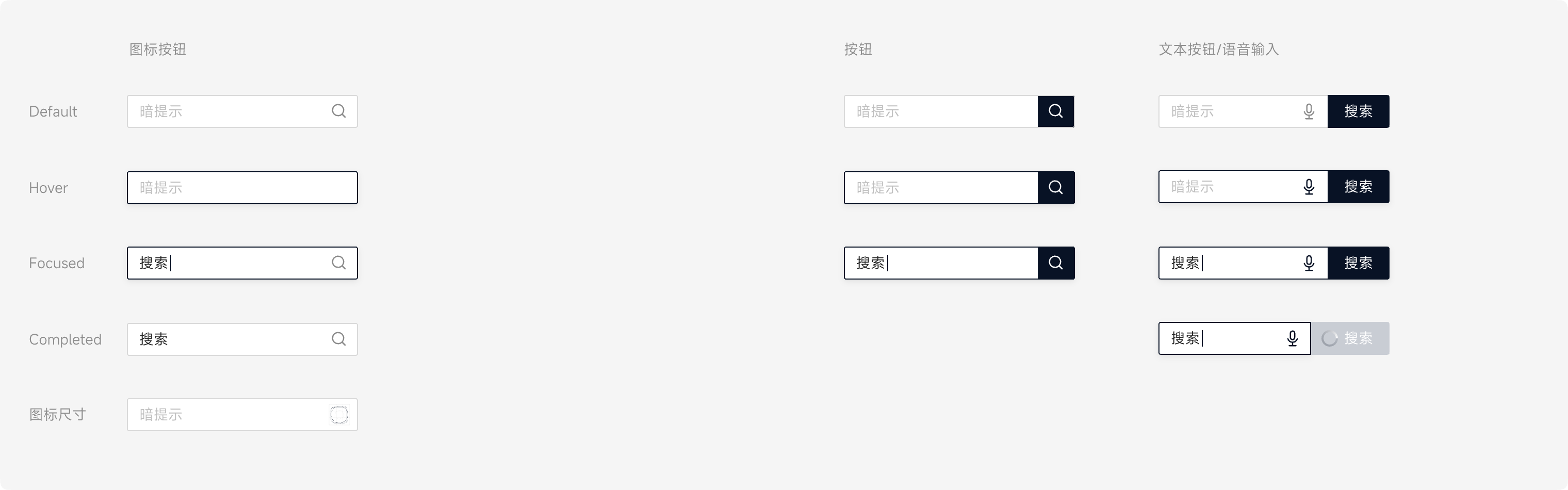 输入框共有 7 种不同的状态,分别为:默认态、选中态、完成态、禁用态、加载态、成功态、报错态