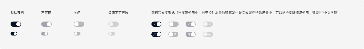 需要表示开关状态/两种状态之间的切换时,和checkbox的区别是,切换switch会直接触发状态改变,而checkbox一般用于状态标记,需要和提交操作配合。