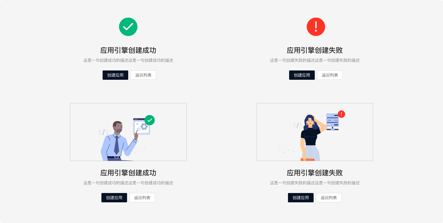 共有七种样式:成功、信息、警告、错误、403、404、500,可根据不同场景配置不同的插画图形。