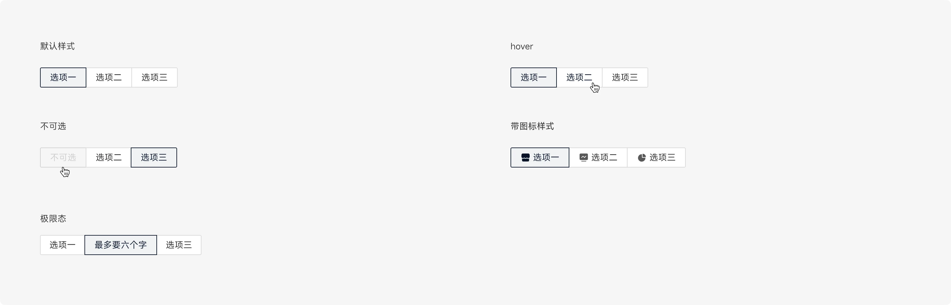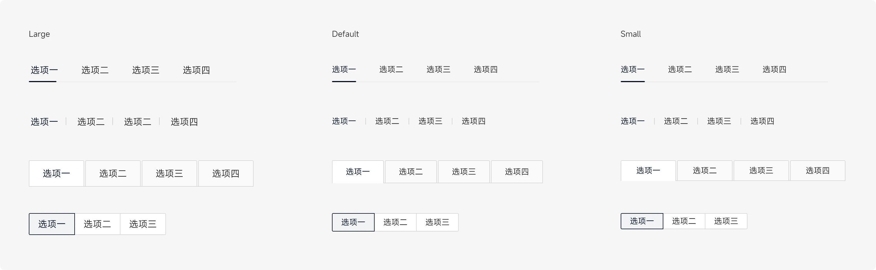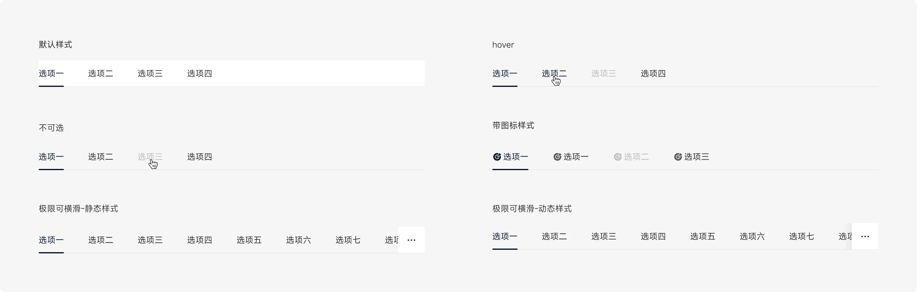 轻量的标签页类型,仅通过文本颜色的变化来指示选中的标签页,适合用于页面信息量多时的次级内容模块。